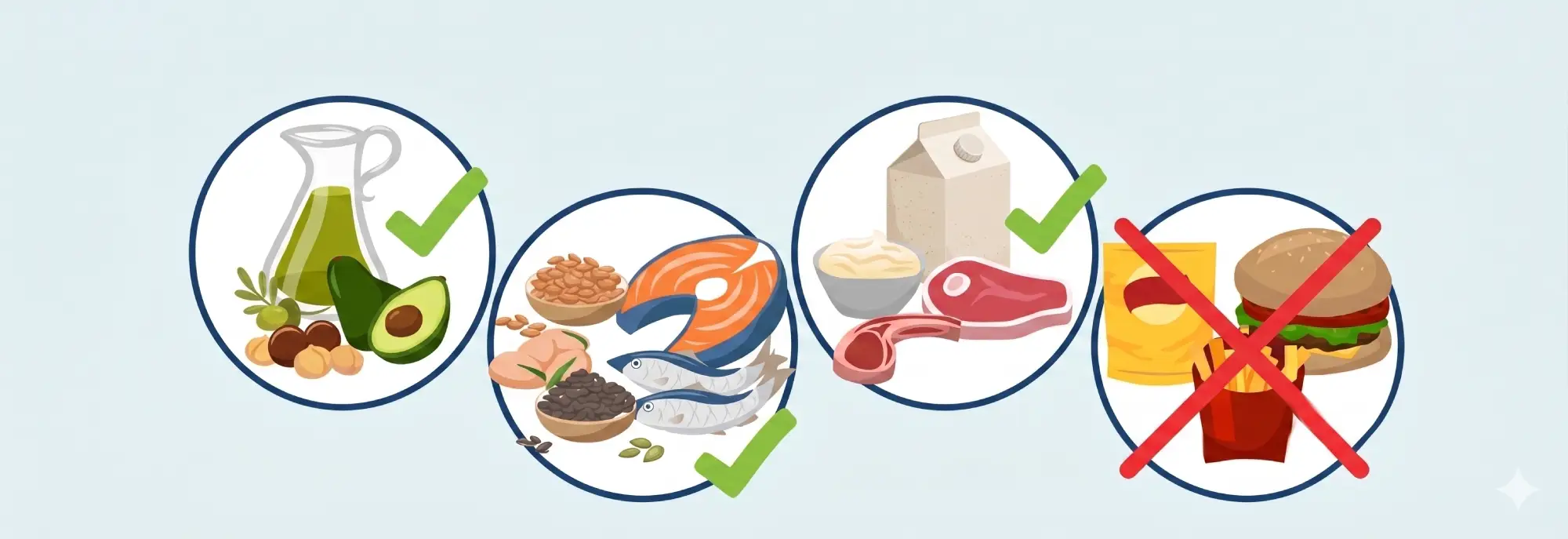 الابتعاد عن الدهون النباتية مثل الكانولا وزيت الذرة و دوار الشمس ) غنية بالاوميجا ٦ ) التي تعتبر سبب للإلتهابات داخل الجسم واستبدالها بكمية بسيطة من الدهون الجيدة الموجودة بوفرة في الطبيعة مثل الدهون المشبعة (الزبدة والشحم والسمن الحيواني المستخلص من الحيوانات المتغذية على الاعشاب fed-Grass (والدهون احادية التشبع الطبيعية مثل زيت الزيتون وزيت الافوكادو وزيت السمسم.