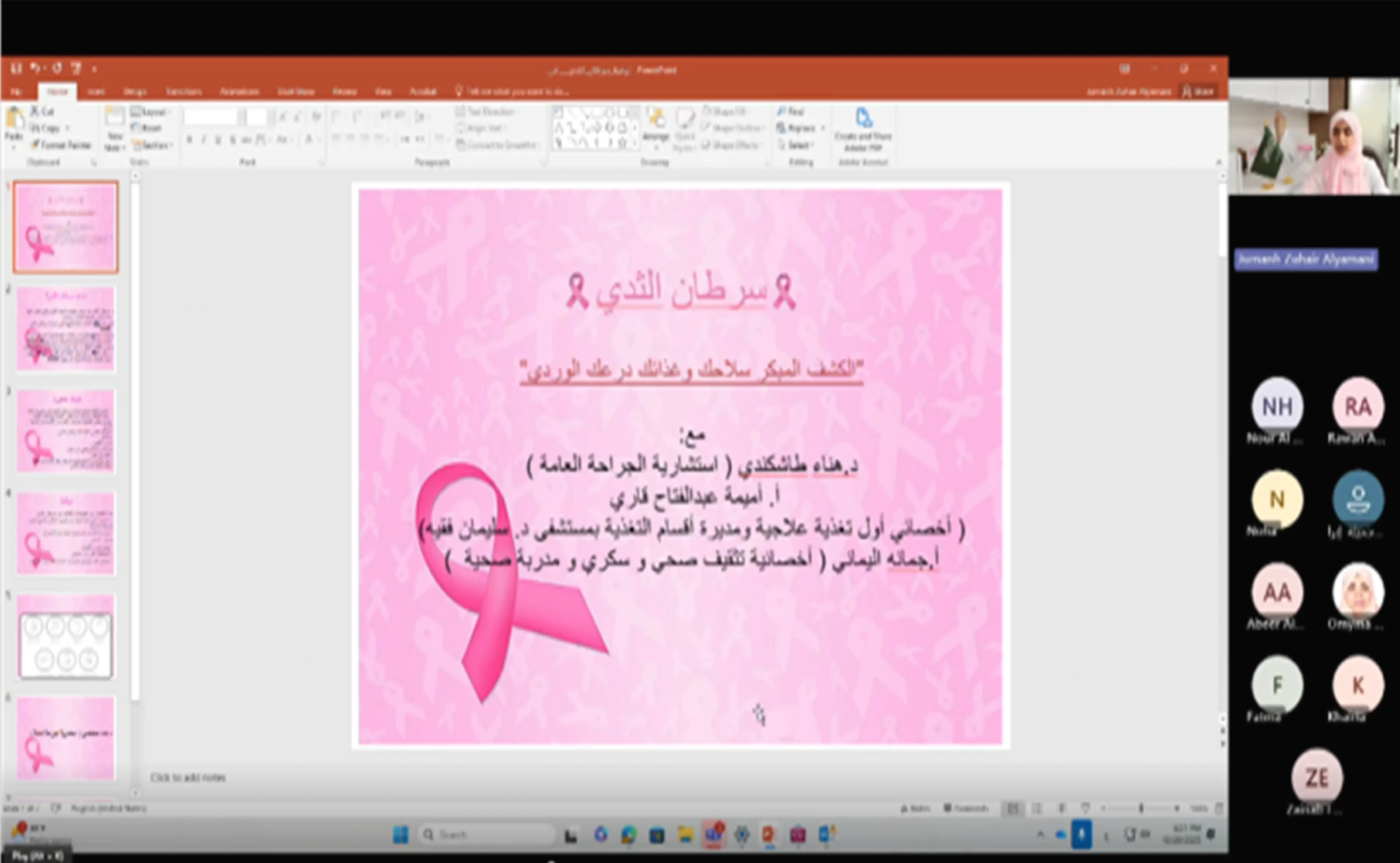 The lecture was delivered by a teamof experts, including General Surgery Consultant Dr. Hanaa Tashkandi,Director of the Clinical Nutrition Department at Faqih Hospital Ms. OmaimaGhari, and Health Education Specialist Ms. Jumana Al-Yamani. Theevent was promoted on social media to reach the widest possible audience,aiming to educate participants on the importance of early screening, therelationship between nutrition and cancer prevention, as well as providingdetailed information on treatment and prevention methods, and offering anopportunity for attendees to ask medical questions and receive professionalguidance.