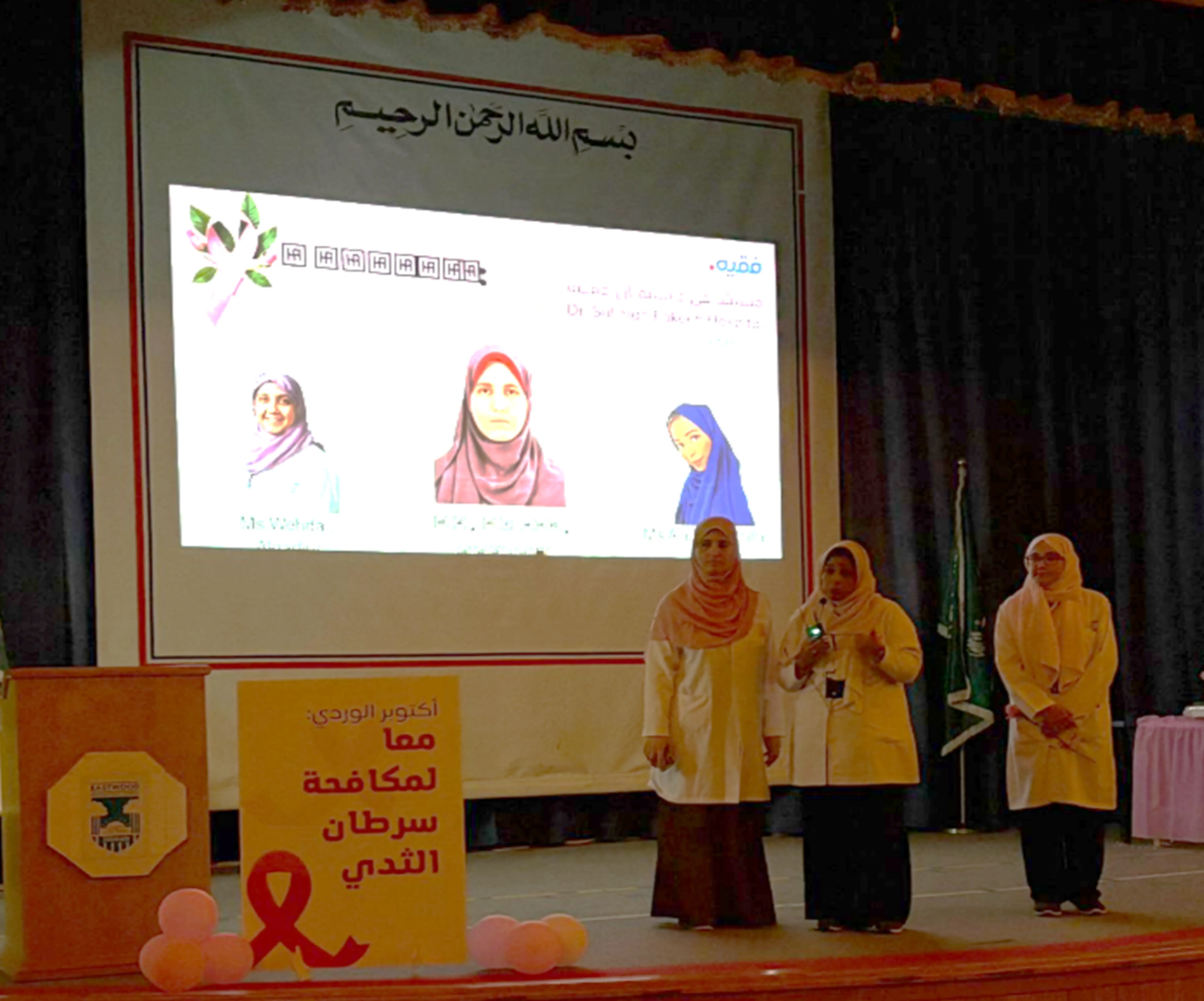 2. As part of the breast cancer awareness activities, an awareness day was held in response to requests fromschools to educate their teachers, students, and mothers about breast cancerand the importance of early detection. An online lecture titled "EarlyScreening is Your Weapon and Your Nutrition is Your Pink Shield" wasconducted on October 20, targeting Al-Fursan International Schools.